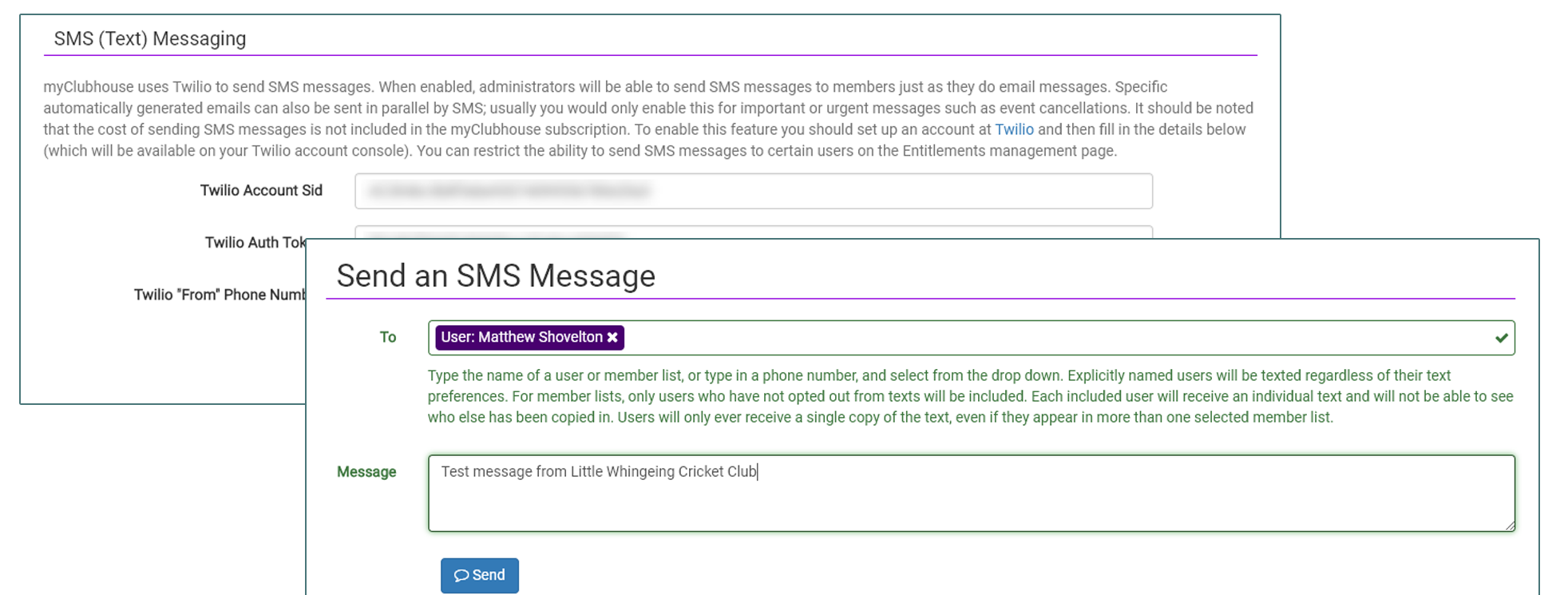 myClubhouse does also support SMS text messaging using Twilio . You will need to set up your own Twilio account and then paste the necessary details into the club settings on myClubhouse. Once SMS is enabled, you can send text messages as you would emails, making use of Member Lists etc. Also, you can set up one or more of the auto-generated emails to also send a text message; this could be useful for, say, Event cancellation messages.