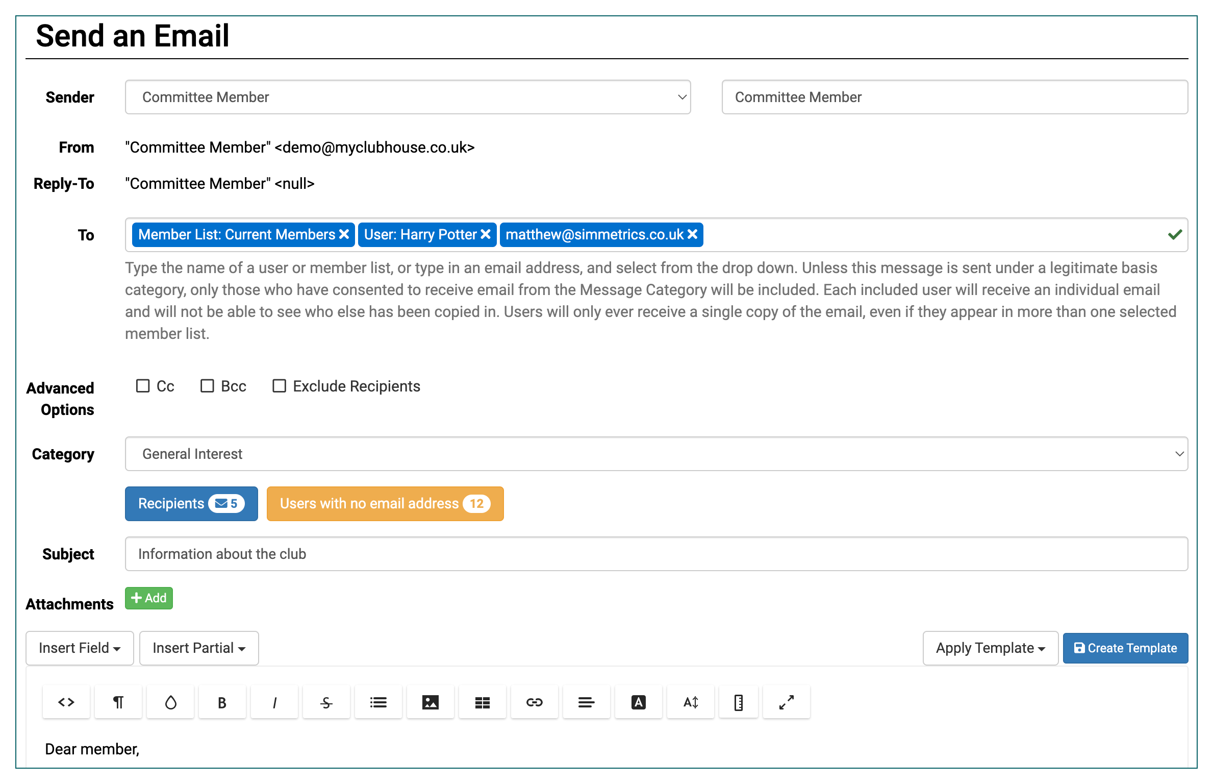 "Absolutely. The Send an Email page allows you to format an email and send it to any section of the membership. Each member will get their own, individually addressed, copy of the email (we don't use cc or bcc, so there is no danger of accidentally publicising your members' email addresses).