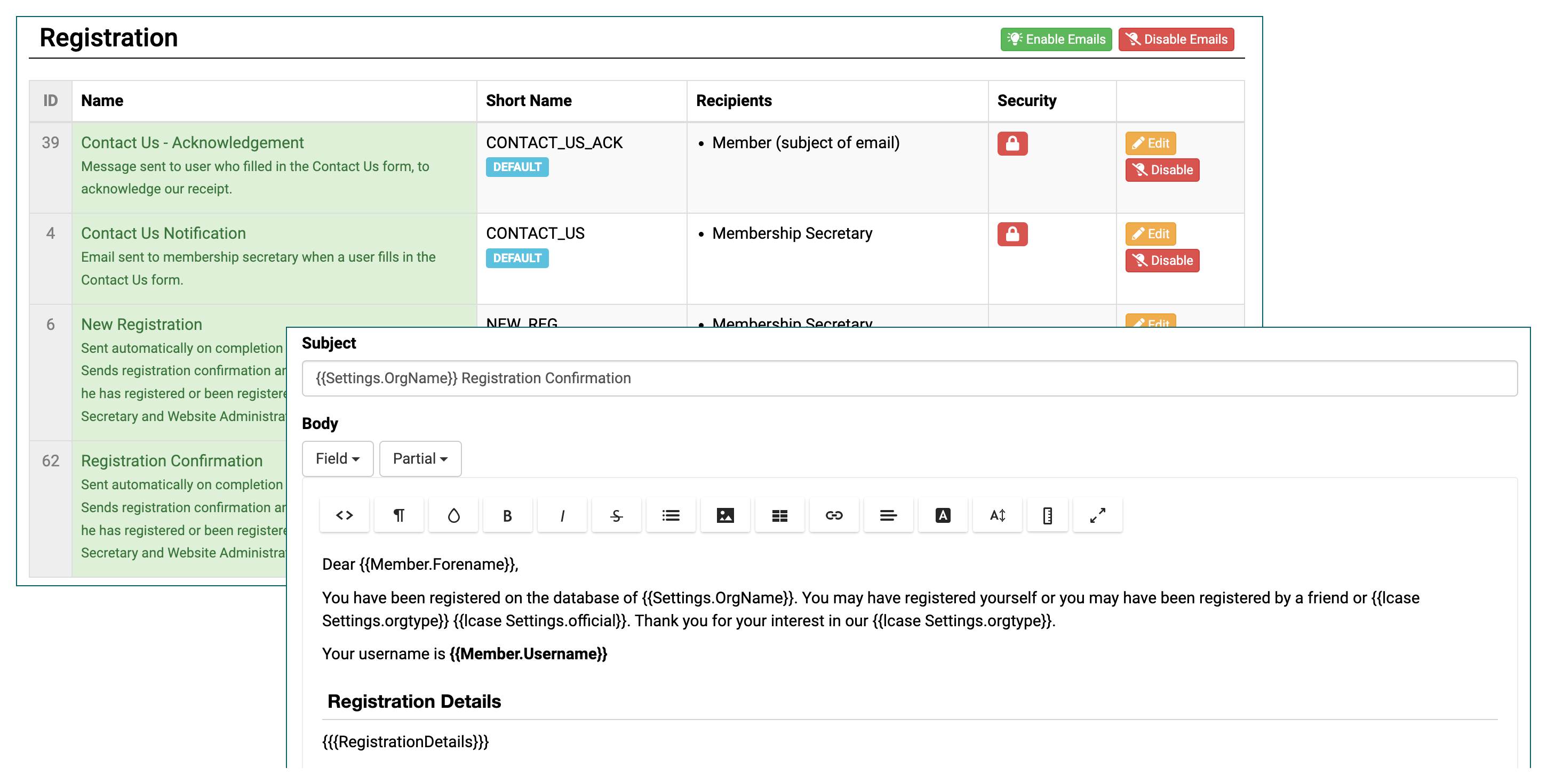 Yes you can. myClubhouse has lots of auto-generated emails that are sent at various points during a person's membership of the club. Each of these is defined as a template which can be tailored to suit your needs. Emails are sent in HTML form, so you can add whatever formatting you like. You can also select which members will receive a copy of the email, or 'switch the email off' completely. You can also define standard headers and footers that will be added to every email sent from the system; this is useful where you want to add a banner with your logo to the top of each email; or, perhaps, you want to use it to add sponsors' messages or promote your Easy Fundraising page.