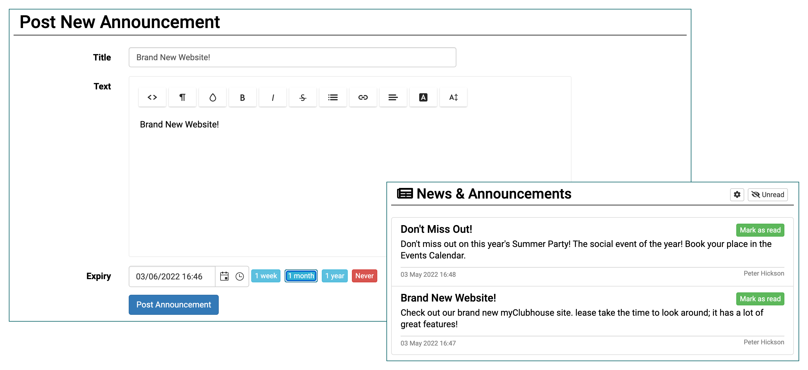 As well as sending emails out to your membership, you can also publish news and announcements on the front page of your myClubhouse site. Once members have read announcements, they can mark them as read and they will be removed from the front page (for them).