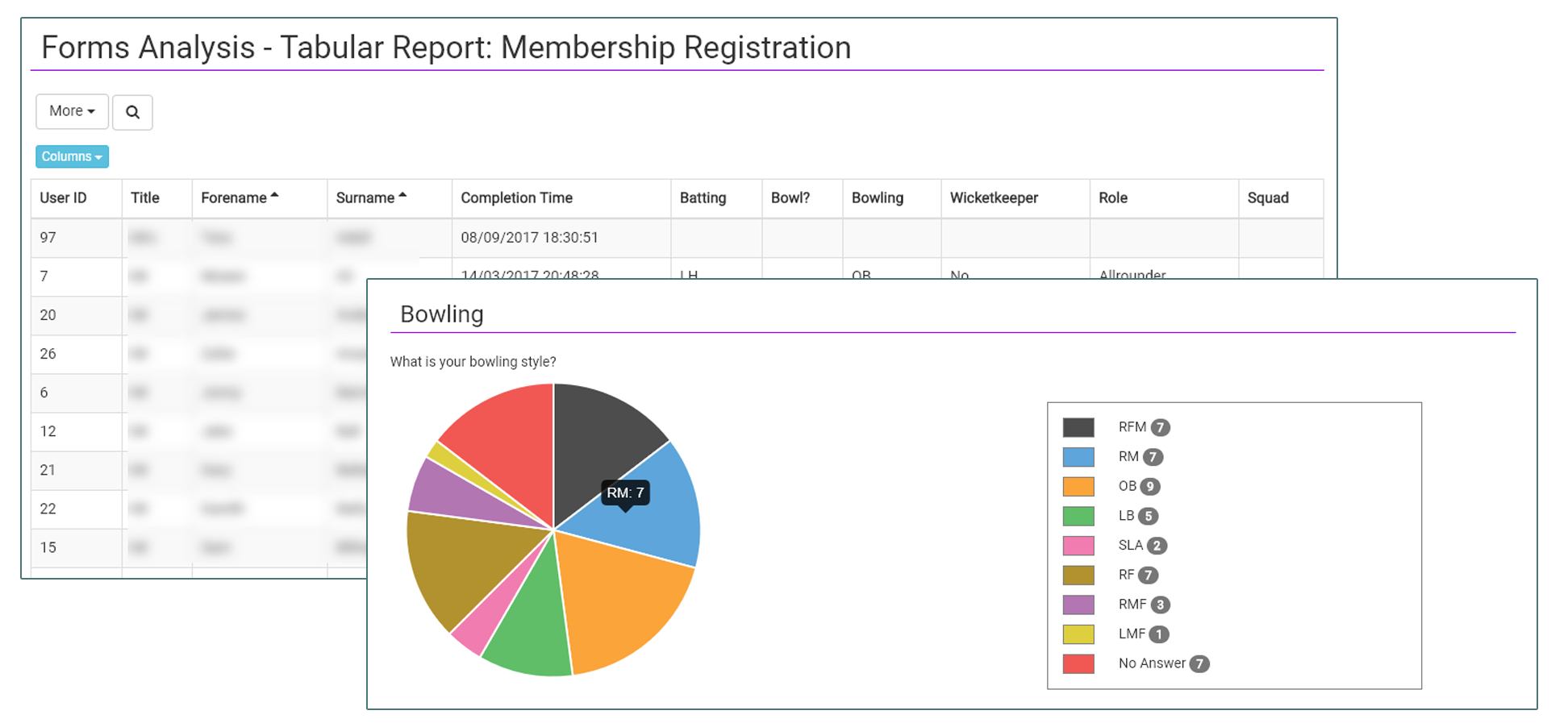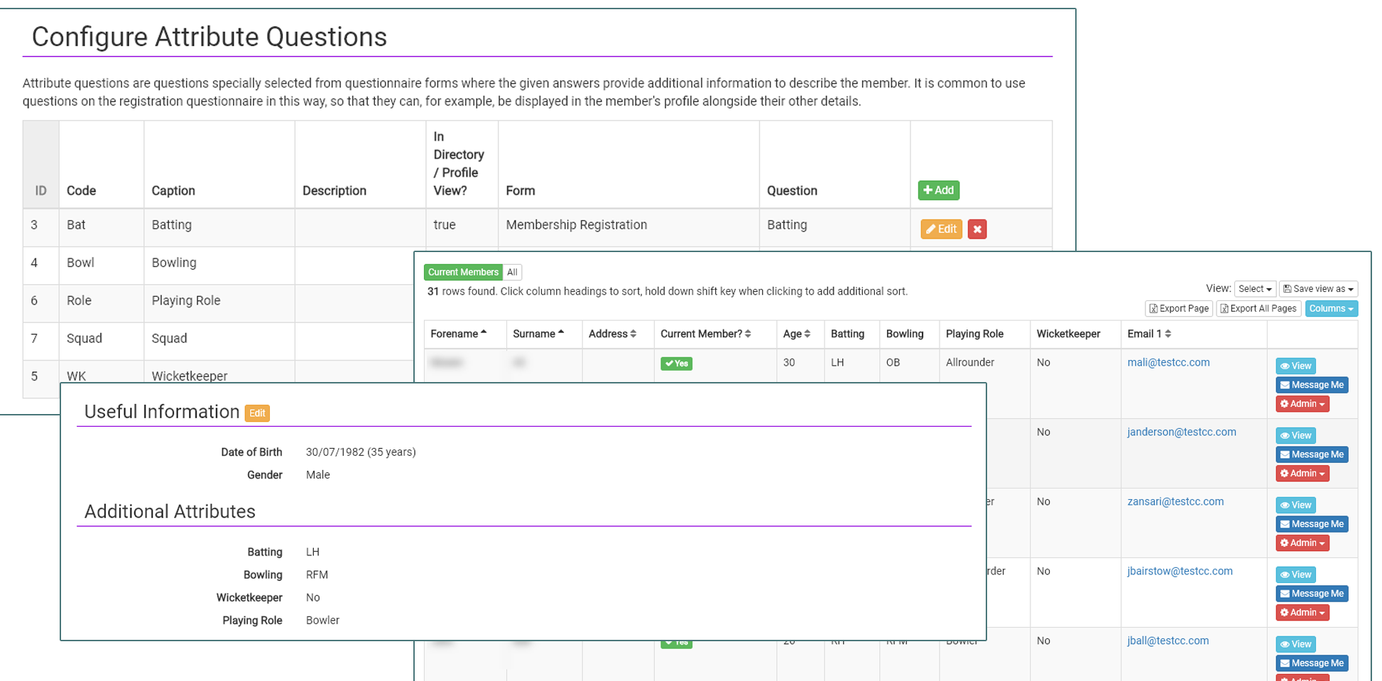 Sometimes it's useful to extend the information that effectively describes each member. For example, you may want to store each member's LTA membership number or ranking. Or maybe their preferred playing position or, for cricket, their bowling style. This information can all be collected using Forms. Particular questions can then be marked as 'attributes of the member'. This means that their answers to the questions will be displayed in the Member Directory and user profile, making it easy to access the data. When defining attribute questions, you can say whether the answers should be visible to all members that can view the Member Directory, or just administrators. Also, you can reference user attributes directly when defining Member Lists.