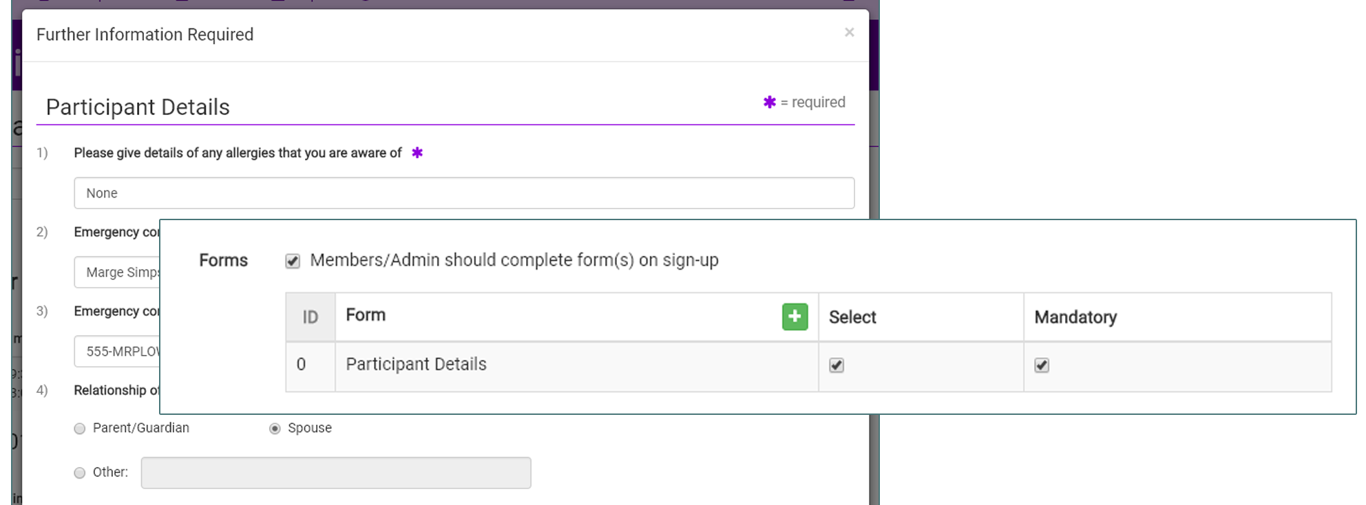 Forms can also be used when members are signing up to Events. You can connect one or more Forms to an Event, defining whether it is mandatory to fill them in. So for example, you may wish to collect child protection inFormation for each Event sign-up; this can be done with Event Forms. When a member signs up, they are presented with the Form and must answer at least the mandatory questions. Members can save their answers as defaults so that they don't have to keep entering the same information for multiple similar Event sign-ups.