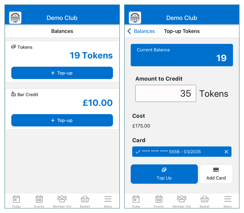 If you have the Token Payments add-on module, members can view their Token balance from the mobile app. If you choose, Tokens can be added to a member's account through their profile page or via the myClubhouse mobile app. Members have the option to pay using their saved credit or debit cards (only via Stripe), or they can add a new one. Top-ups can be configured with a minimum, a maximum, and a daily maximum. Additionally, they can be sold in groups of units, if you want to apply a discount for purchasing larger quantities.