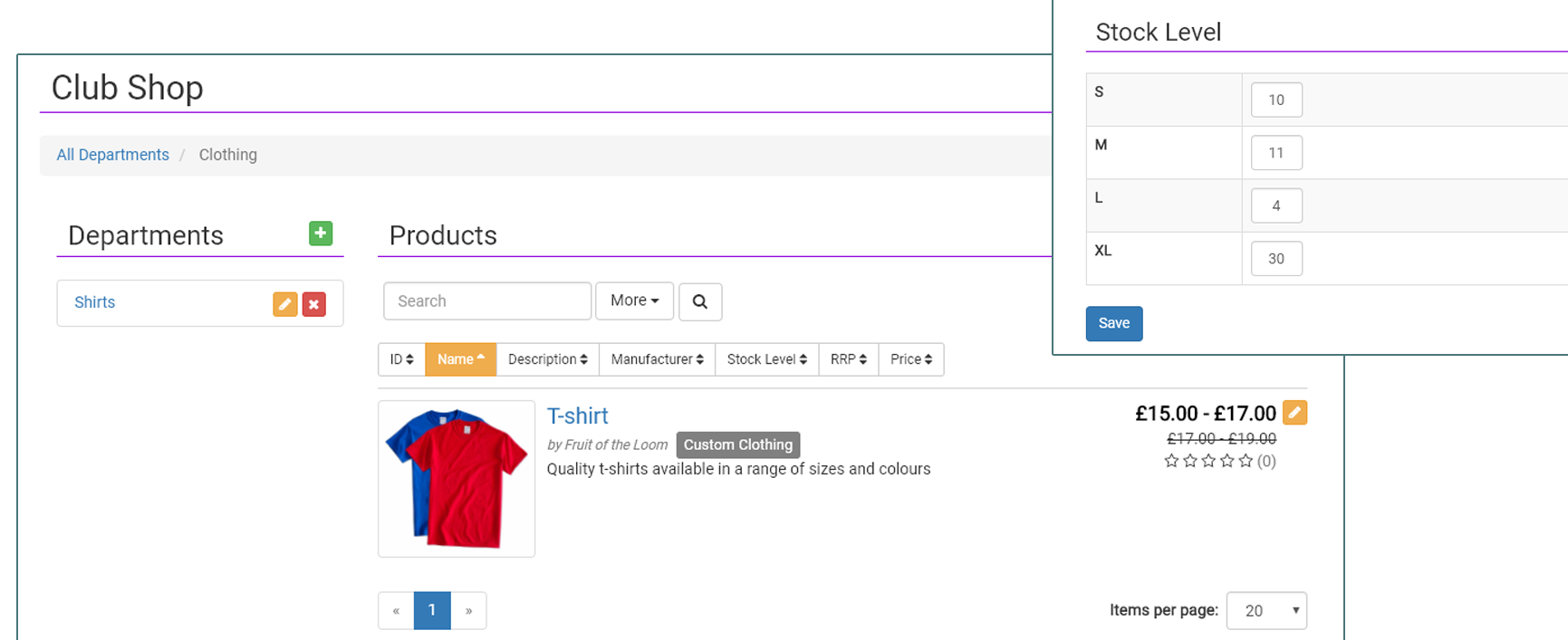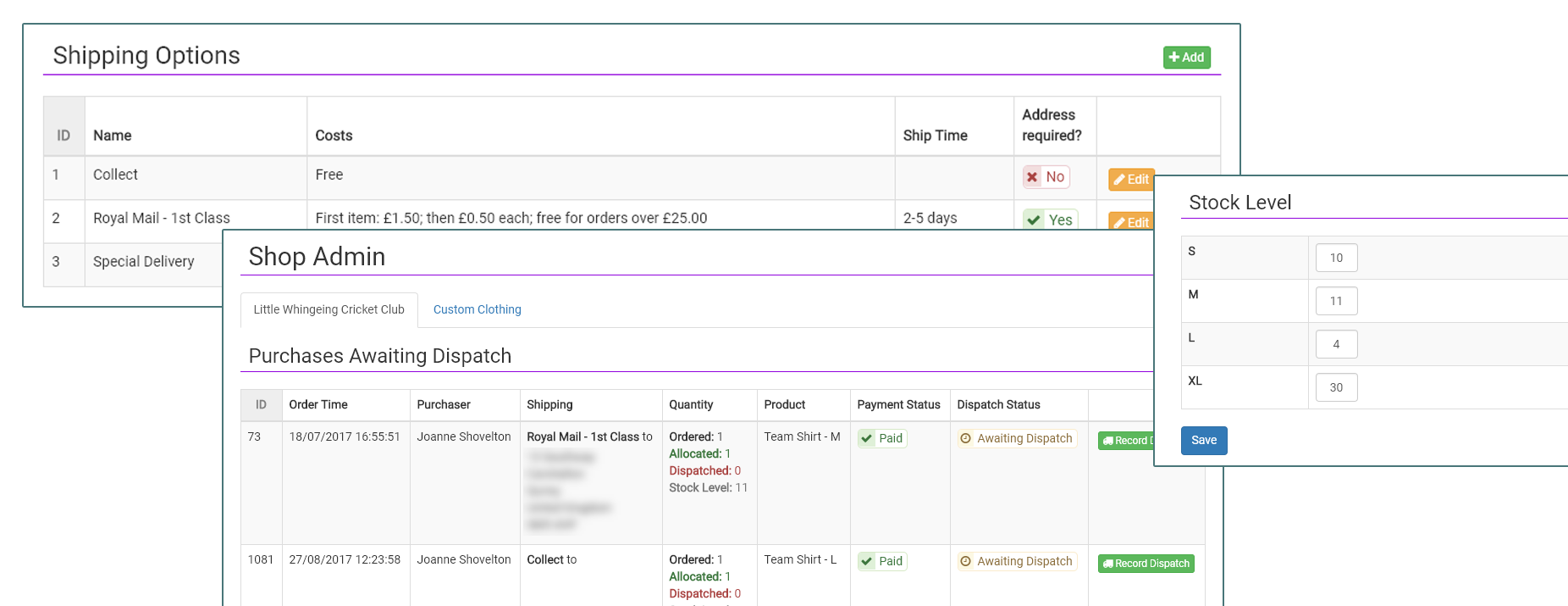For each item in the Shop, you have the option of whether you want to maintain stock levels in the system. If you choose to do so, you can enter and adjust stock levels for each product and variant. When somebody purchases an item, if there is available stock, then this is allocated to the order and the stock level is adjusted down. You can see at a glance the orders that are waiting for stock to be allocated and members get to see a live display of the available stock levels. The stock is only allocated to the order once the member pays. The 'Manage Shop' page shows you all the orders that are awaiting dispatch and allows you to mark when some or all of the goods have been sent; myClubhouse automatically emails the purchaser to let them know that the goods are on their way.