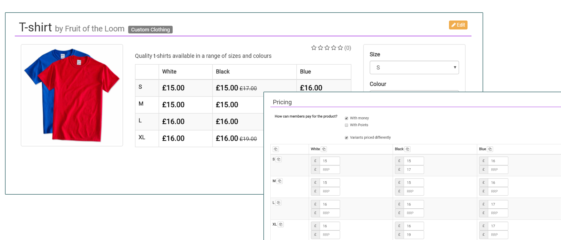 It is possible to have up to two dimensions of variation on a single product. So, for example, you could sell t-shirts in different colours and sizes; members simply select the desired colour and size when adding to their basket. The variations can be anything you want, not just colour and size. The system allows you to maintain stock levels for each variant and also to charge different amounts for each variant; so you could, for example, charge more for larger sizes.
