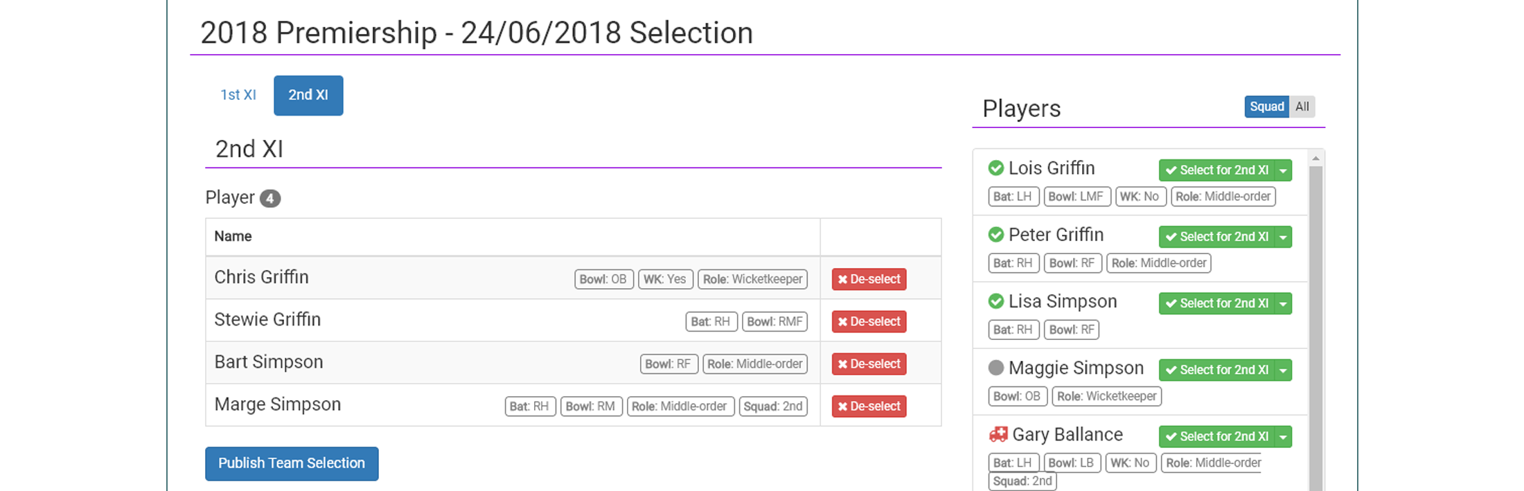 For each match day, you can define the selected list of players for each Team fixture. These Team sheets can then be published on the fixture page in the Events Calendar. When Team selections are published, all players are automatically notified by email. Members can be selected into one of many roles within the Team; for example, you could have defined roles for Player, Reserve, and Scorer. myClubhouse supports a couple of approaches to Team selection: